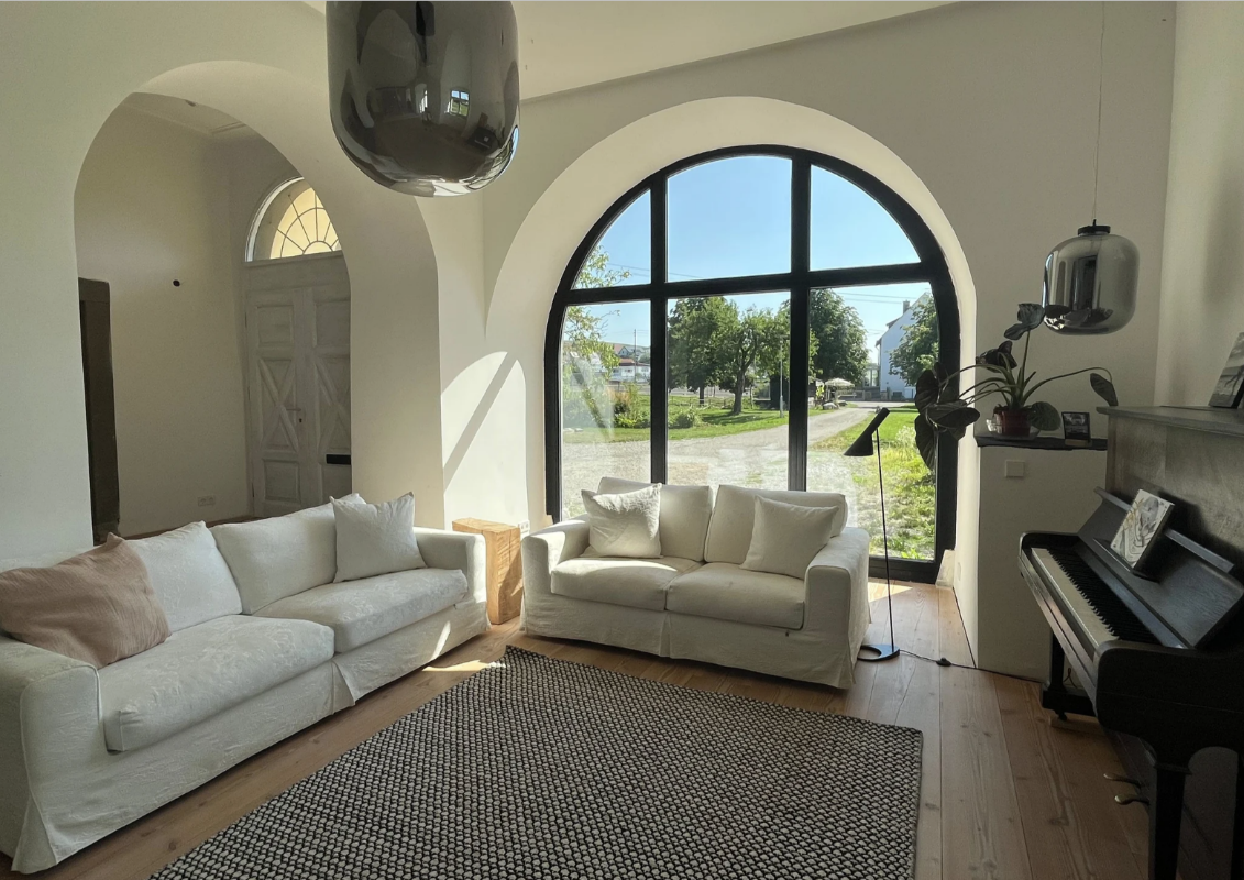 Die Räume im Erdgeschoss sollen zu Wohnräumen saniert werden: Die verschlossenen Torbögen wieder geöffnet und durch Pfosten-Riegelfenster ersetzt werden. Der vorhandene Bodenaufbau im späteren Wohnraum wird entfernt und neu aufgebaut. Die Wand zwischen späterem Wohnzimmer und Essraum wird rückgebaut. Die drei Rundbögen sollen wieder sichtbar hergestellt und mit einer Verglasung geschlossen werden. Generell ist im gesamten Wohnbereich ein Holzboden aus Dielen gewünscht. Der vorhandene Dielenboden mit Fries unterhalb des nachträglich angebrachten Parkettbodens (Fernsehzimmer) wird erhalten. Die Fenster und Fenstertüren im Erdgeschoss und 1. Obergeschoss werden ersetzt. Die historischen Holztüren im 1. Obergeschoss werden überarbeitet und neu gestrichen. Im Erdgeschoss sind keine Bestandtüren vorhanden