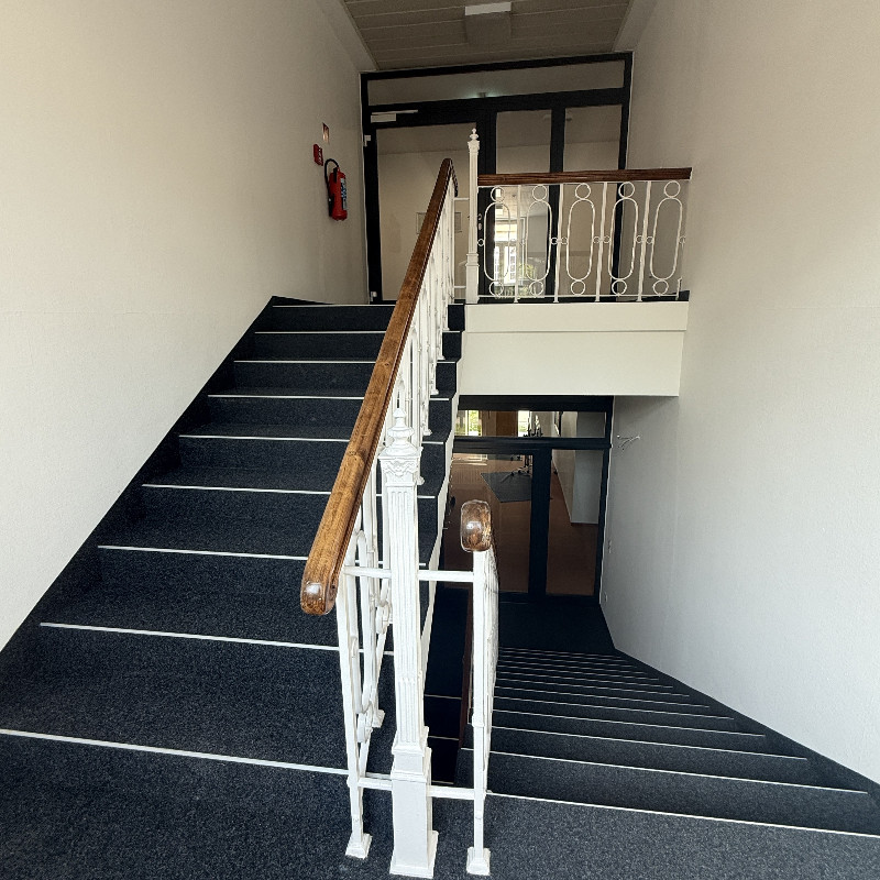Die Fassadensanierung sieht die Ausbesserung des Sockelputzes und eine umfassende Aufbereitung der Backsteinfassade vor, um die Bausubstanz nachhaltig zu sichern. Abschließend werden die Außenanlagen im Zugangsbereich aufgewertet. Dies beinhaltet die Erneuerung der Hoffläche, den Abbruch und zertifizierten Neuaufbau der Treppenanlage sowie die restauratorische Instandsetzung der Eingangsüberdachung und den fachgerechten Austausch der Hauseingangstür.