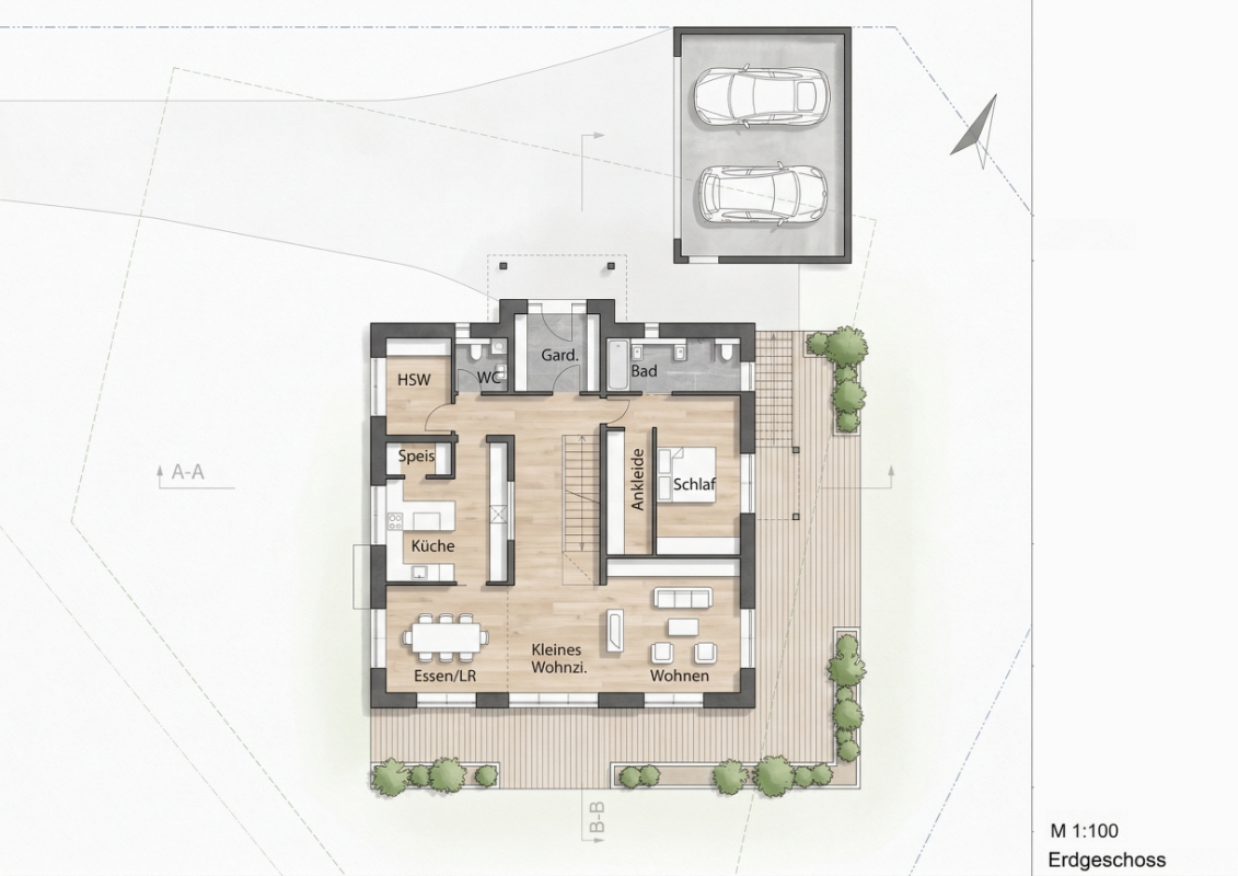 Neubau, Planung für das Wohnhaus mit Büroerweiterung. Das Gebäude wurde nach den Rohbauarbeiten in Eigenleistung ausgeführt.